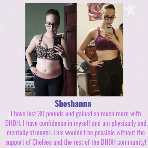 "DHDH has completely changed my life physically and mentally. This program has been sooo much more than I was anticipating. With all the components that come with the membership my favorite is the workouts and Chelsea truly always being available for questions.